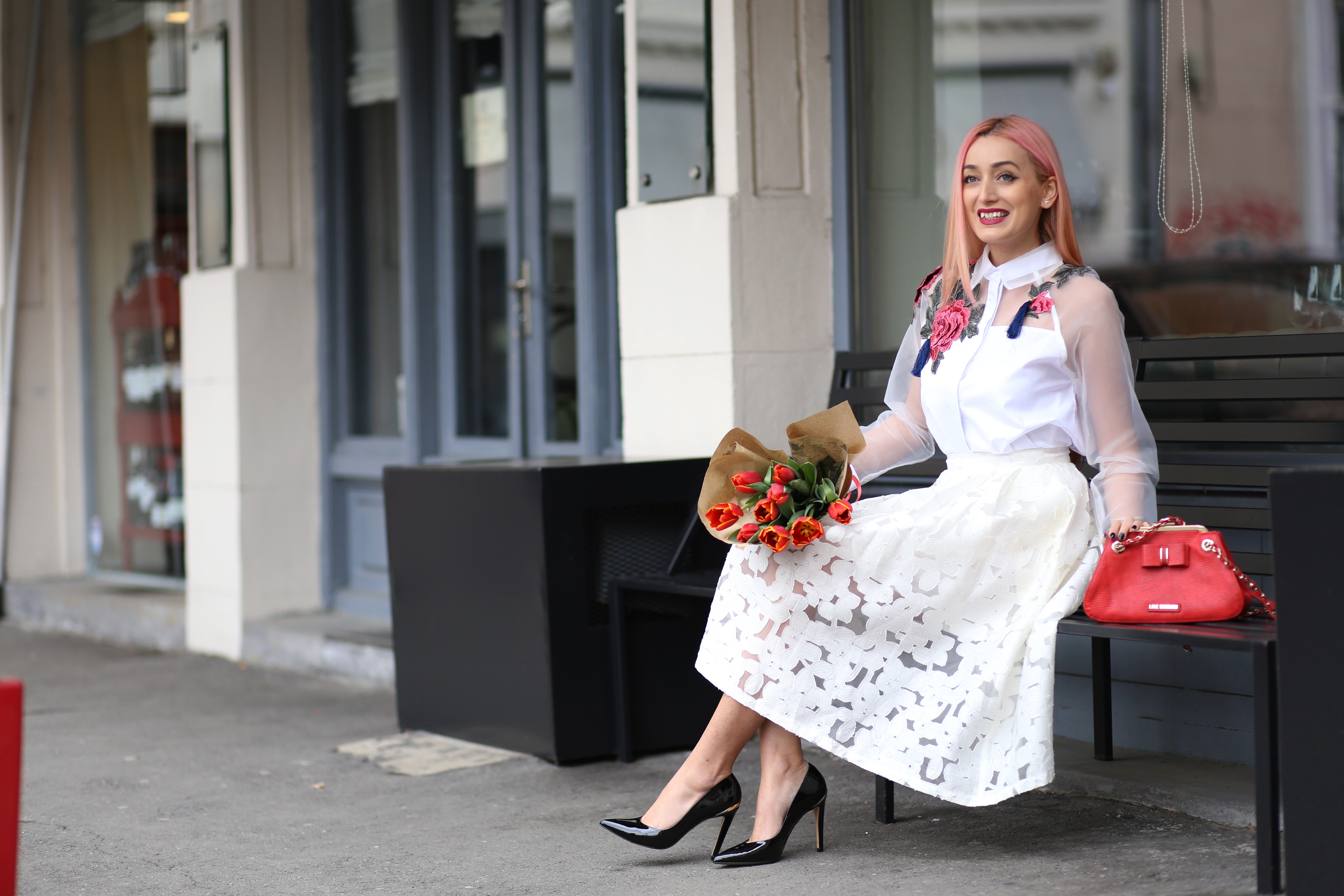 May you have a bright & happy Spring, my dear! I’ve waited so much for this day, finally the winter is gone (at least I hope that) and in three months summer will be here <3 Just like nature, I feel I am blooming in the spring. To celebrate this amazing day, called also Martisor in Romanian traditions (boys offer girls martisoare & flowers, symbols of Spring, of the nature that revives), I wore a special outfit focused on flowers elements. I chose the most beautiful embroidered shirt (here) and my gorgeous flared dress (here), both with flowers. The shirt is made from cotton & organza, it has embroidered roses and it has pockets, being perfect also for jeans outfits. The skirt also have pockets and it is made entirely from lace. I completed my outfit with red bag & tulips and with my fav stilettos.