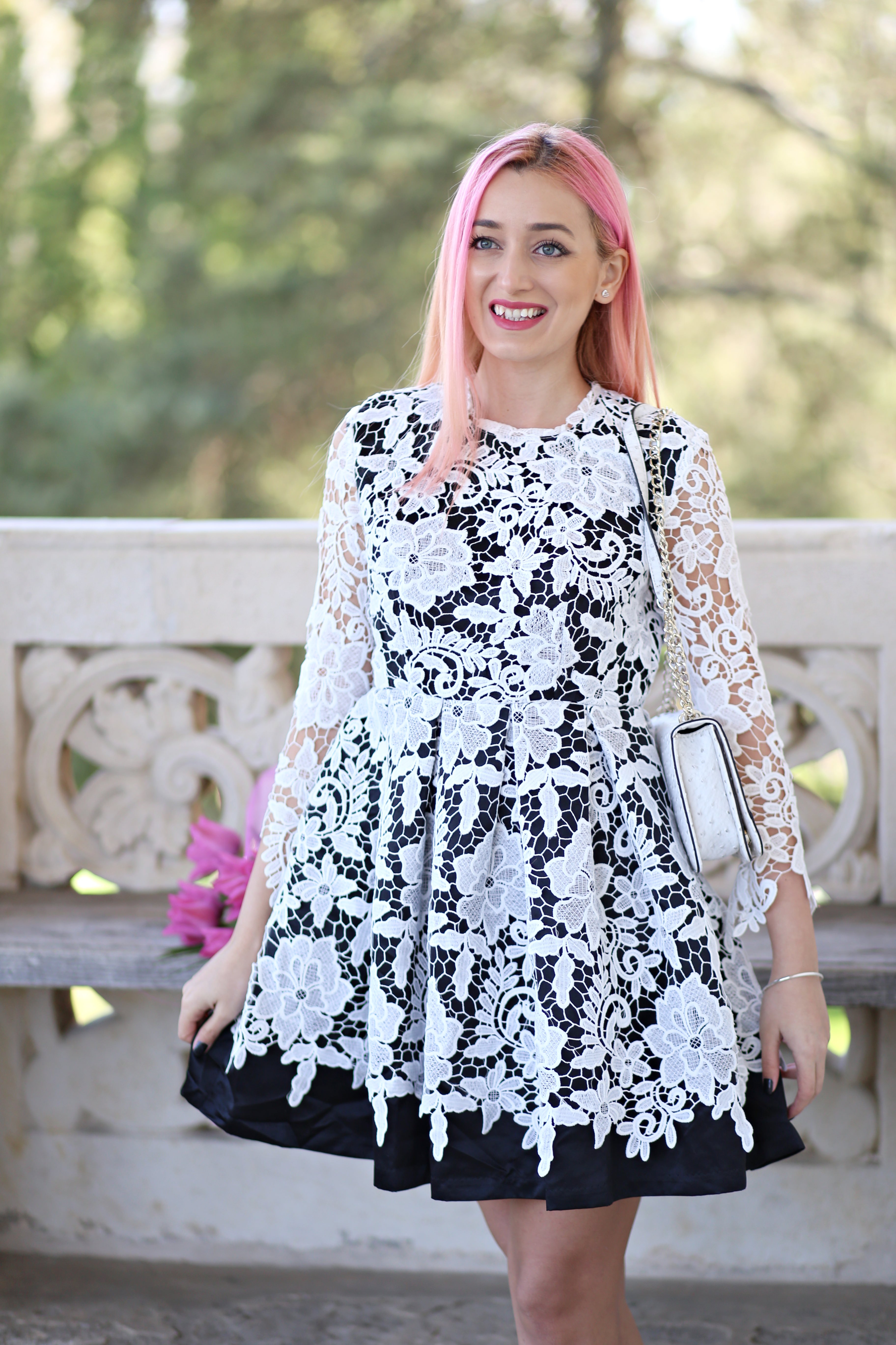 I do what I do and most of the time I come back to princess outfits, even though boho chic style is the one that definitly defines me, the elegant & girlish outfits are my favorite. I felt exactly like a princess in this crochet dress (here), while I was walking through one of the most beautiful Romanian palaces, Mogosoaia. The dress is entirely made from crochet and it has lining, I love the black and white contrast. My dress has a super discount and here you can find more models made from cotton, silk and other soft fabrics. I completed the outfit with pink tulips that perfectly matched my pink hair and with the smile he gave me, with my new burgundy stilettos from Zee Lane and with my new Guess bag.